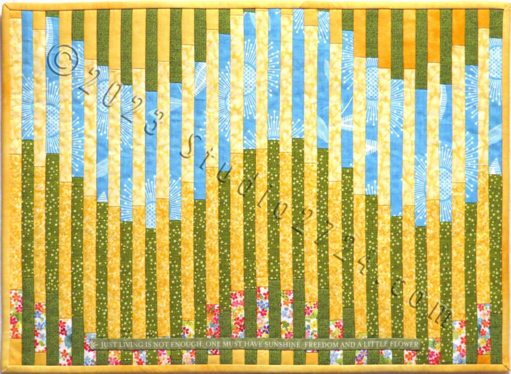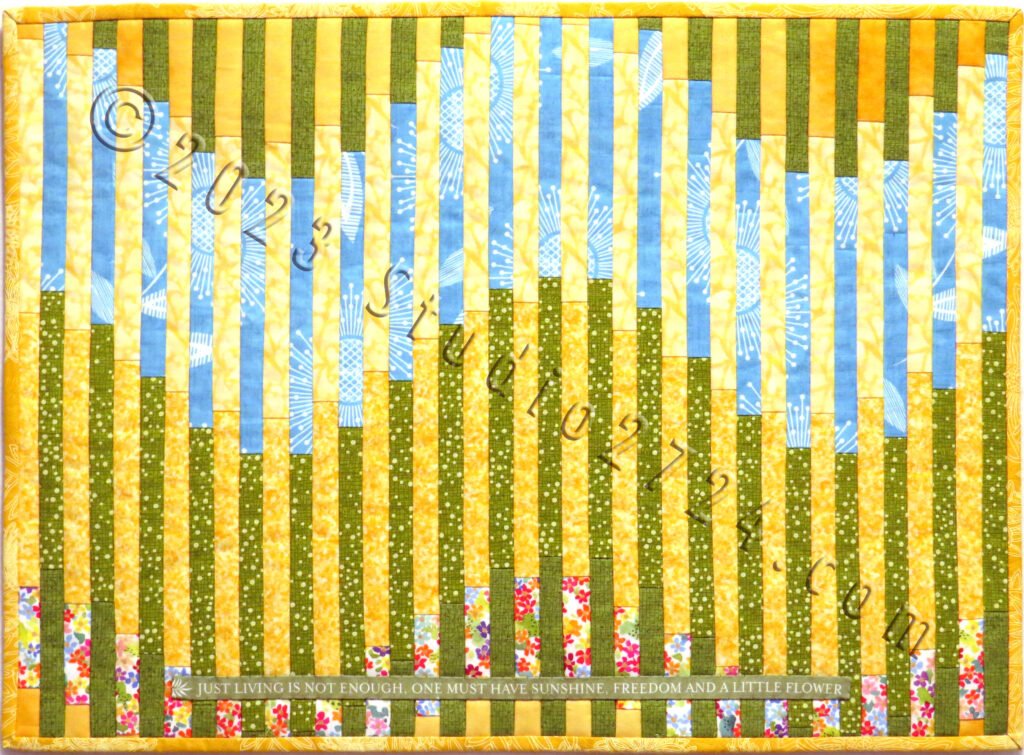 Whether you see the reflection of the sunrise and set over waves consistently rolling in and out on a beach of sand OR a mirage in the desert under the rising and setting hot sun, this quilt works well as a wall hanging or table runner.